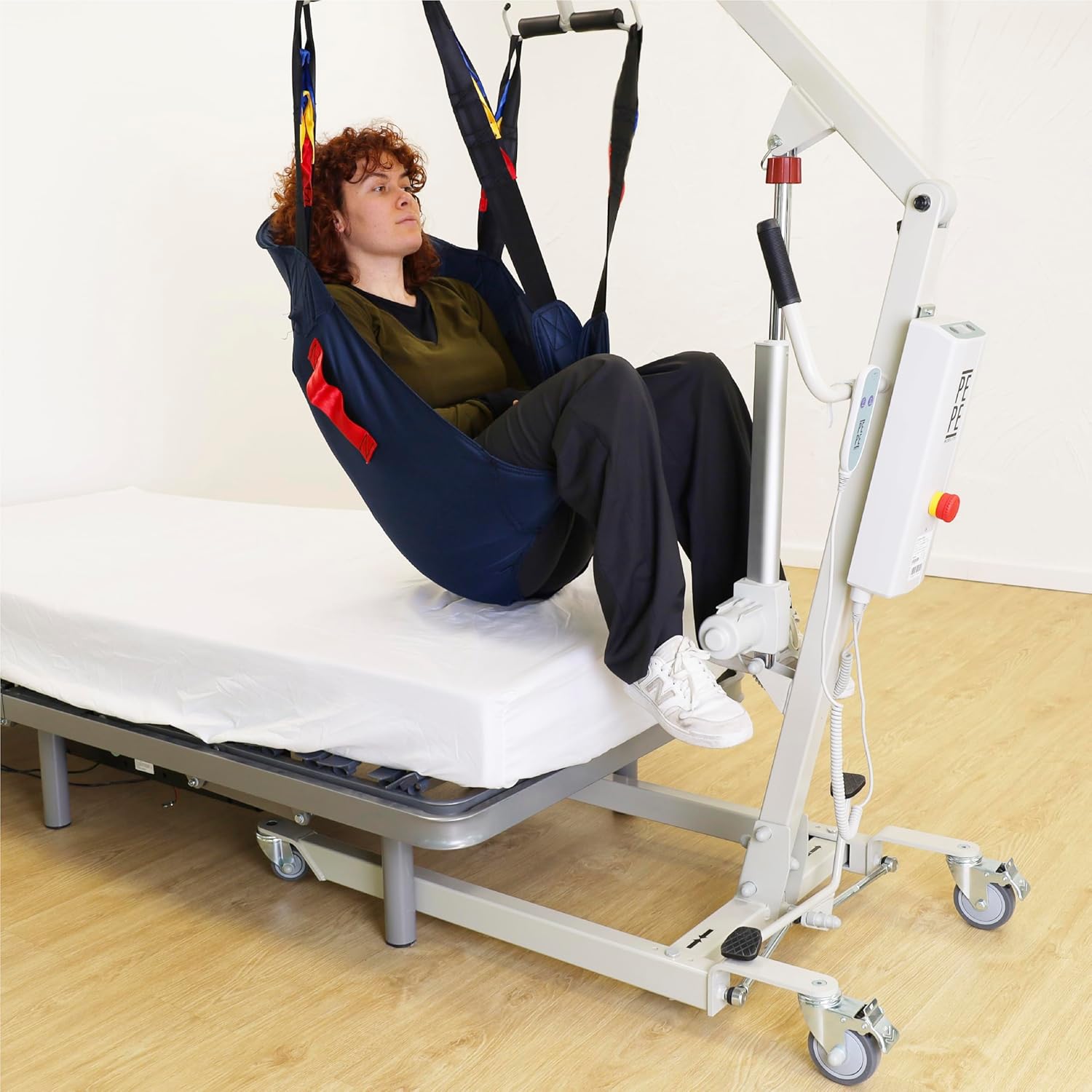 Elektrischer Patientenlifter mit Hebegurt – sicherer Transferkran bis 150 kg Tragkraft, verstellbares Untergestell und Not-Aus-Funktion
